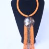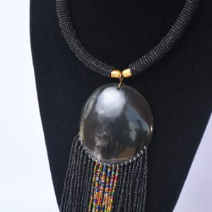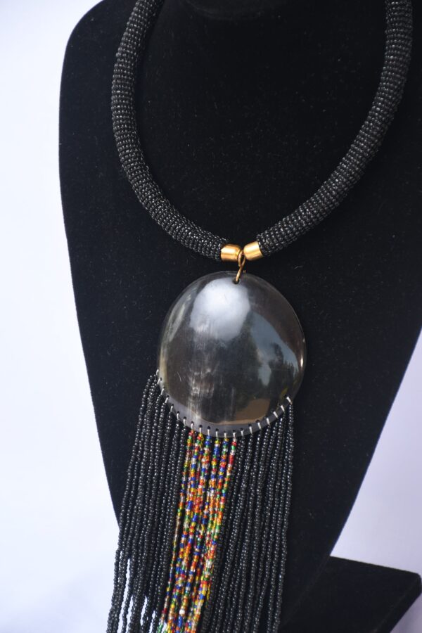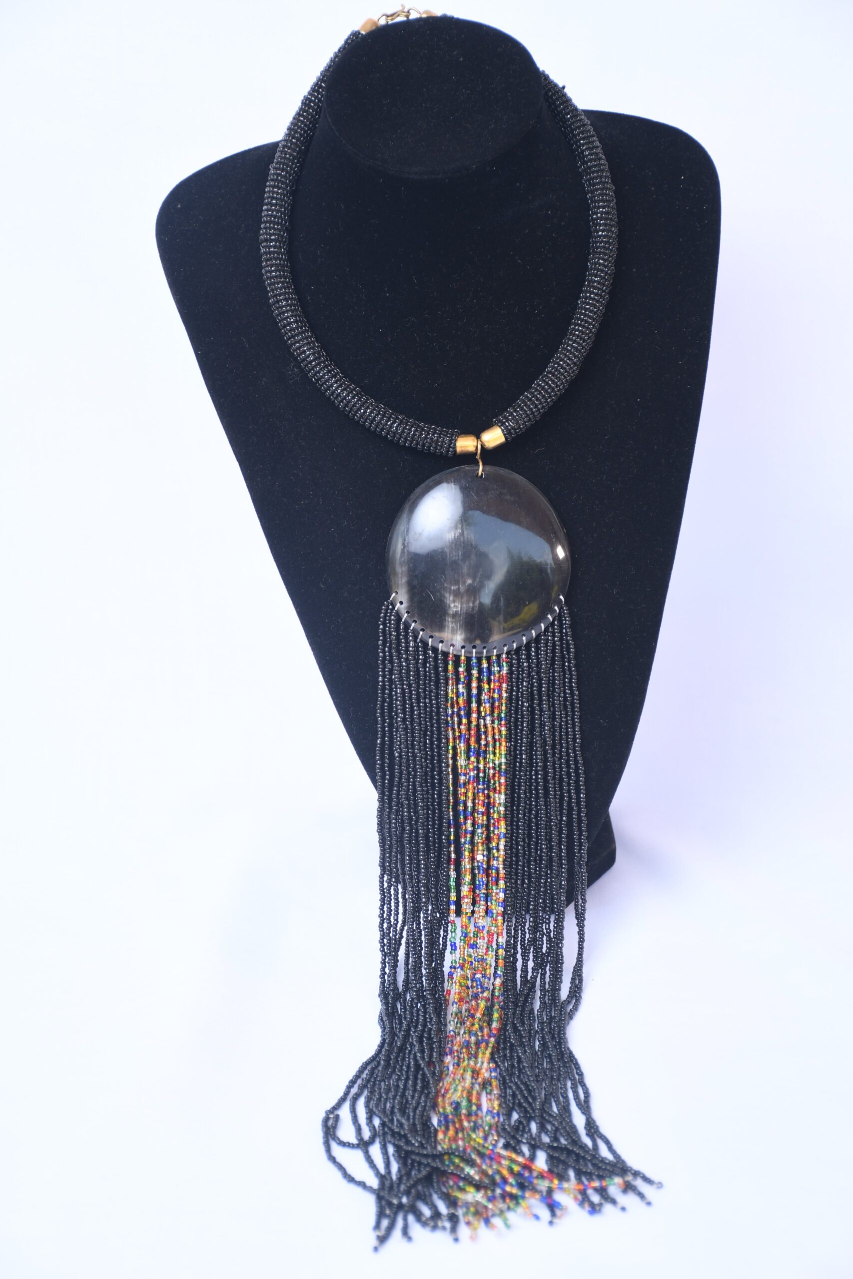 Make a bold statement with this handcrafted African beaded necklace featuring a dramatic smoky dome pendant and cascading beaded tassels. The striking contrast between the black beaded rope chain and vibrant multicolored central beadwork creates an eye-catching piece that seamlessly blends traditional African craftsmanship with contemporary style. The brass-toned accents and substantial pendant add a luxurious touch to this unique piece.