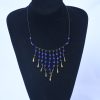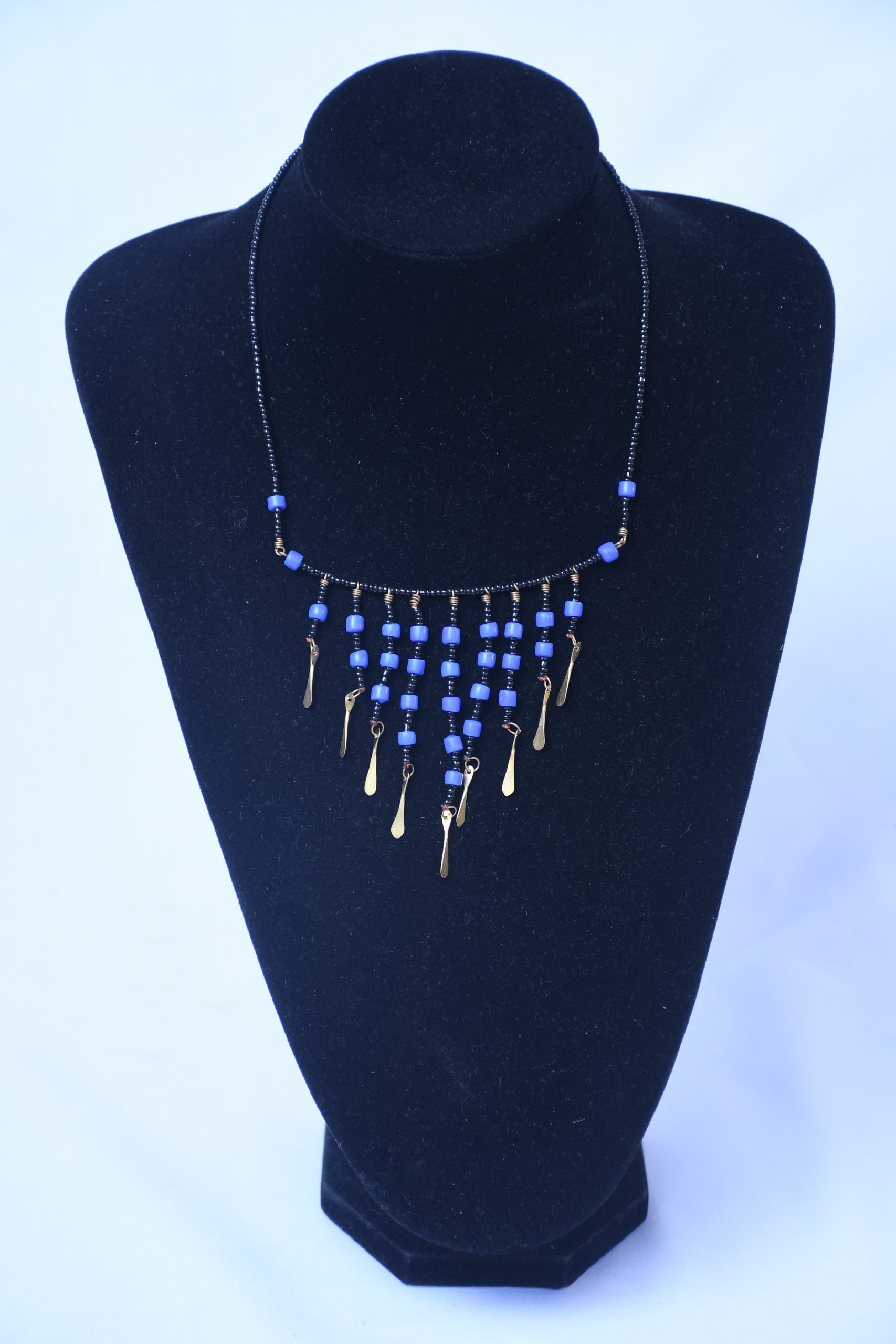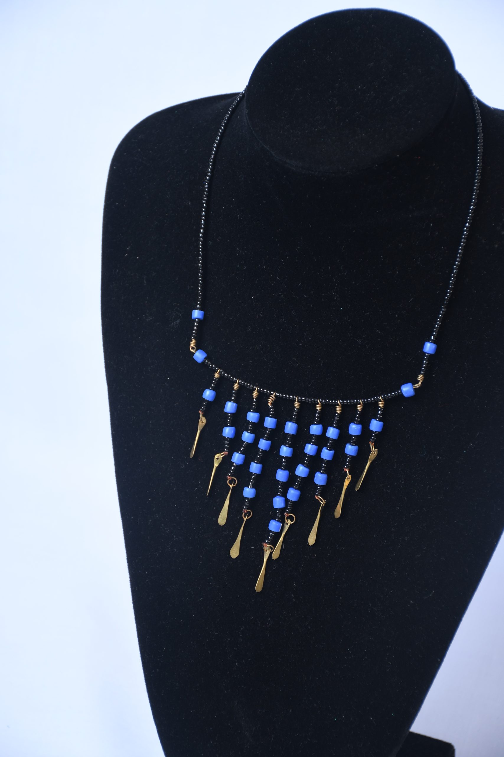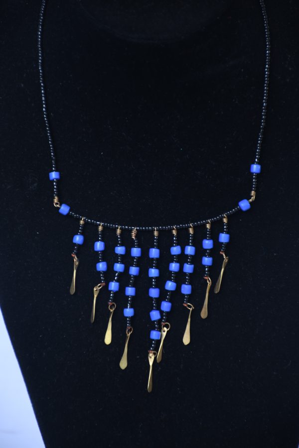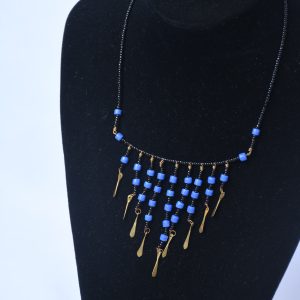 Add a touch of bohemian charm to your look with this black beaded necklace featuring vibrant blue beads and delicate gold dangles. The intricate arrangement of beads and dangles creates a captivating, cascading effect, perfect for adding a unique and stylish accent to any outfit. This necklace is a perfect blend of modern design and bohemian flair.
