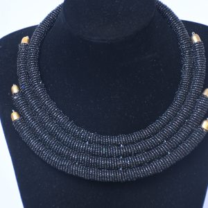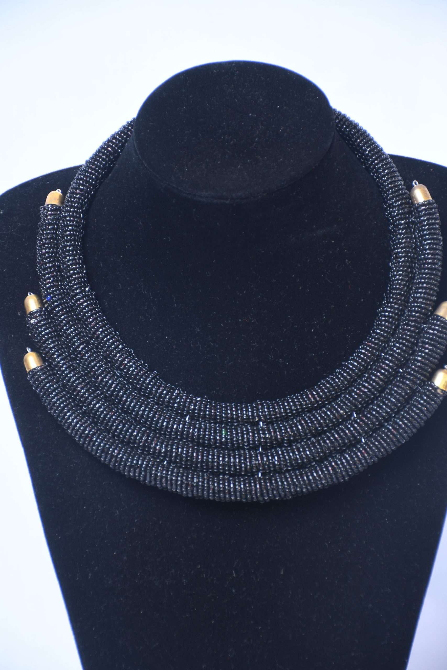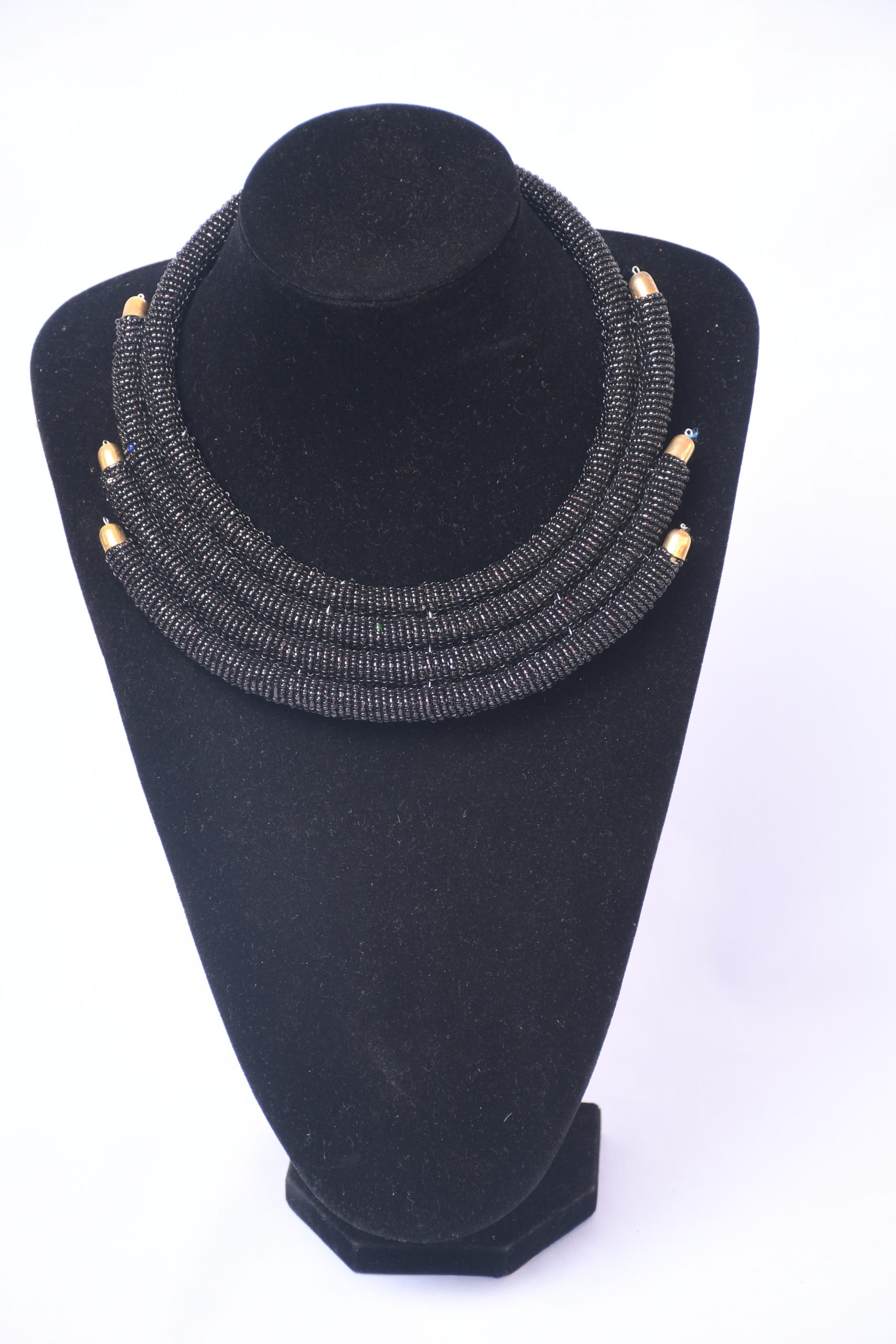 Add a touch of sophisticated drama to your look with this elegant black five-strand beaded necklace. The intricately woven black beads create a striking layered effect, perfect for making a bold yet refined statement. The subtle metallic accents provide a touch of understated glamour, making this necklace a versatile and chic accessory.