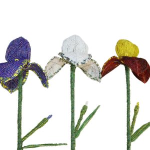 Elegant Handcrafted Beaded Iris Bouquet – A magnificent, artisan-made arrangement featuring seven large iris blooms in a regal mix of purple, white, and yellow glass seed beads. This luxurious and everlasting floral sculpture is a striking statement piece, offering timeless beauty with zero maintenance. Perfect for sophisticated home decor or as an unforgettable, unique gift.