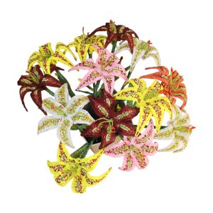 Indulge in the dramatic beauty of this handcrafted beaded stargazer/Tiger Lily Bouquet. This elaborate arrangement features a dozen or more large, sweeping blooms, each meticulously detailed to capture the speckled patterns and curved petals of the exotic lily. The sophisticated, rich color scheme includes deep burgundy red, bright lemon yellow, soft speckled pink, and pristine white, all intricately woven from thousands of high-quality glass seed beads. The central stamens are accented with vibrant highlights, giving each flower a lifelike sparkle. As a true piece of artisan-made, everlasting decor, this bouquet is a magnificent centerpiece that requires absolutely no maintenance. It’s a premium, substantial gift for the discerning collector or a luxurious way to infuse your home with bold color and timeless, global artistry. This piece is a testament to dedicated craftsmanship and a guaranteed conversation starter.
