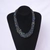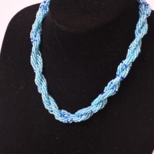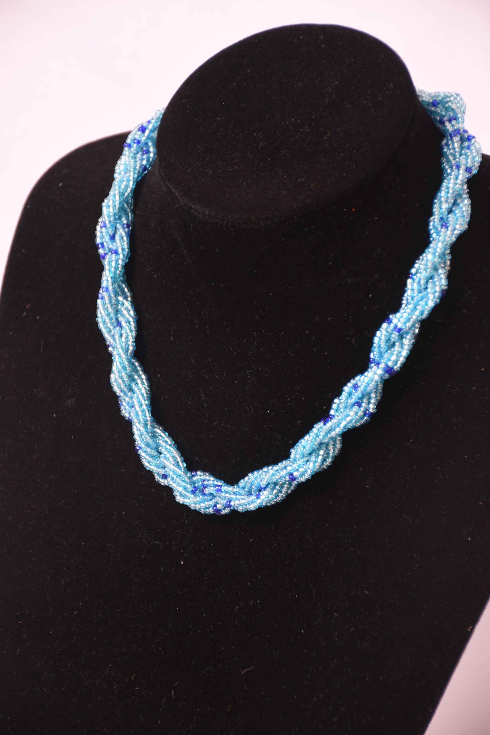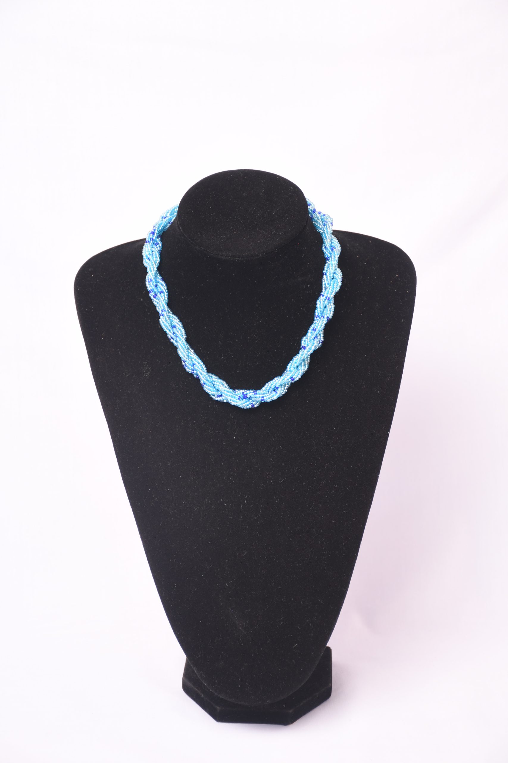 Embrace a touch of serene elegance with this light blue braided beaded necklace. The delicate blue beads are intricately braided, creating a beautiful and textured design. This piece adds a subtle yet stylish accent to any outfit, perfect for both casual and dressier occasions.