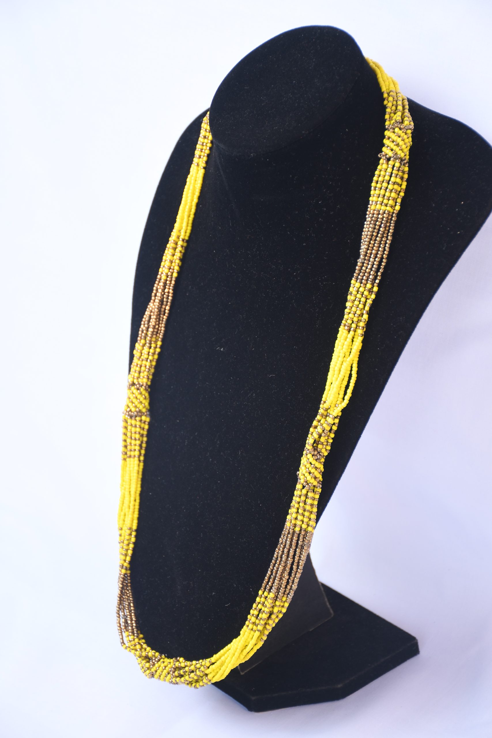“Long yellow and brown multi-strand beaded necklace. A bohemian and vibrant accessory.”