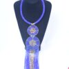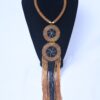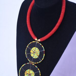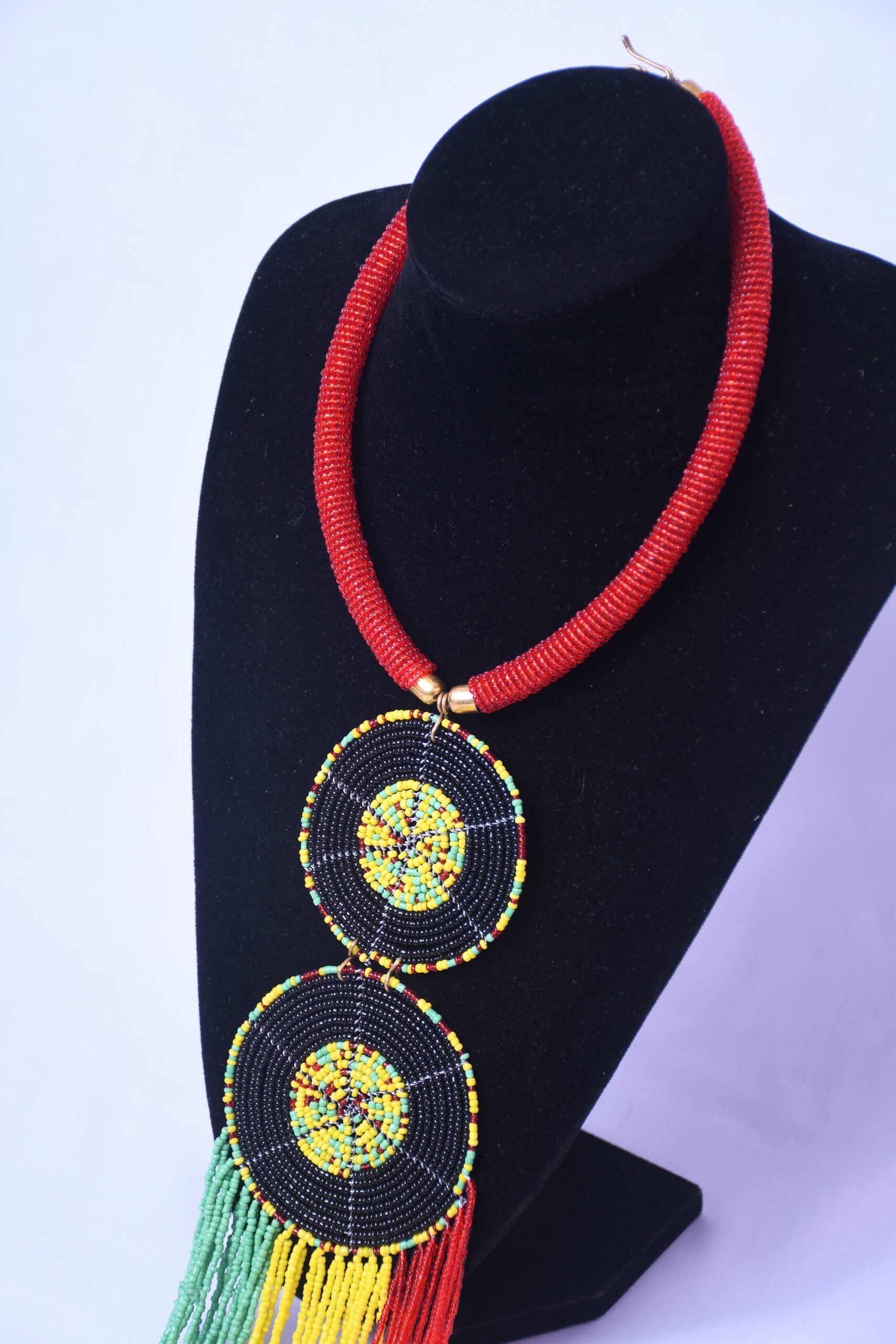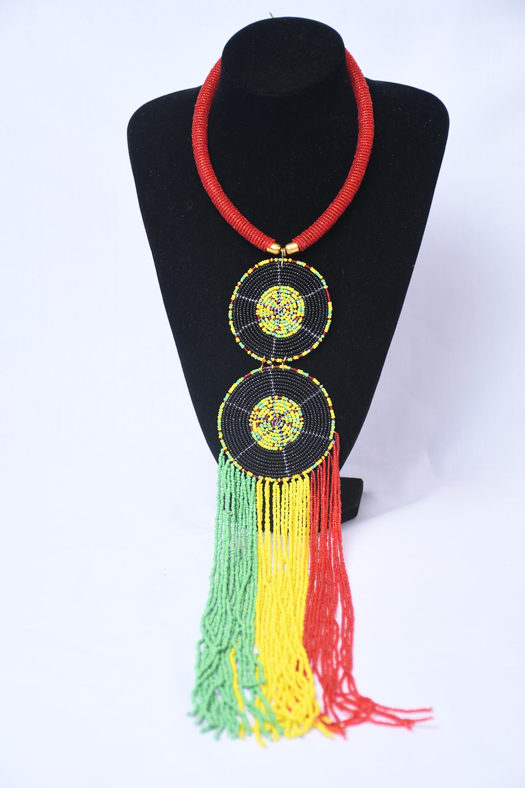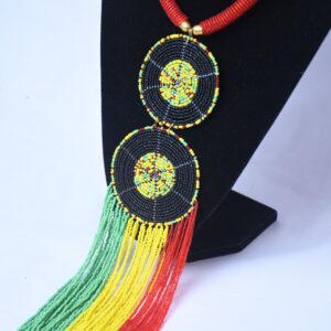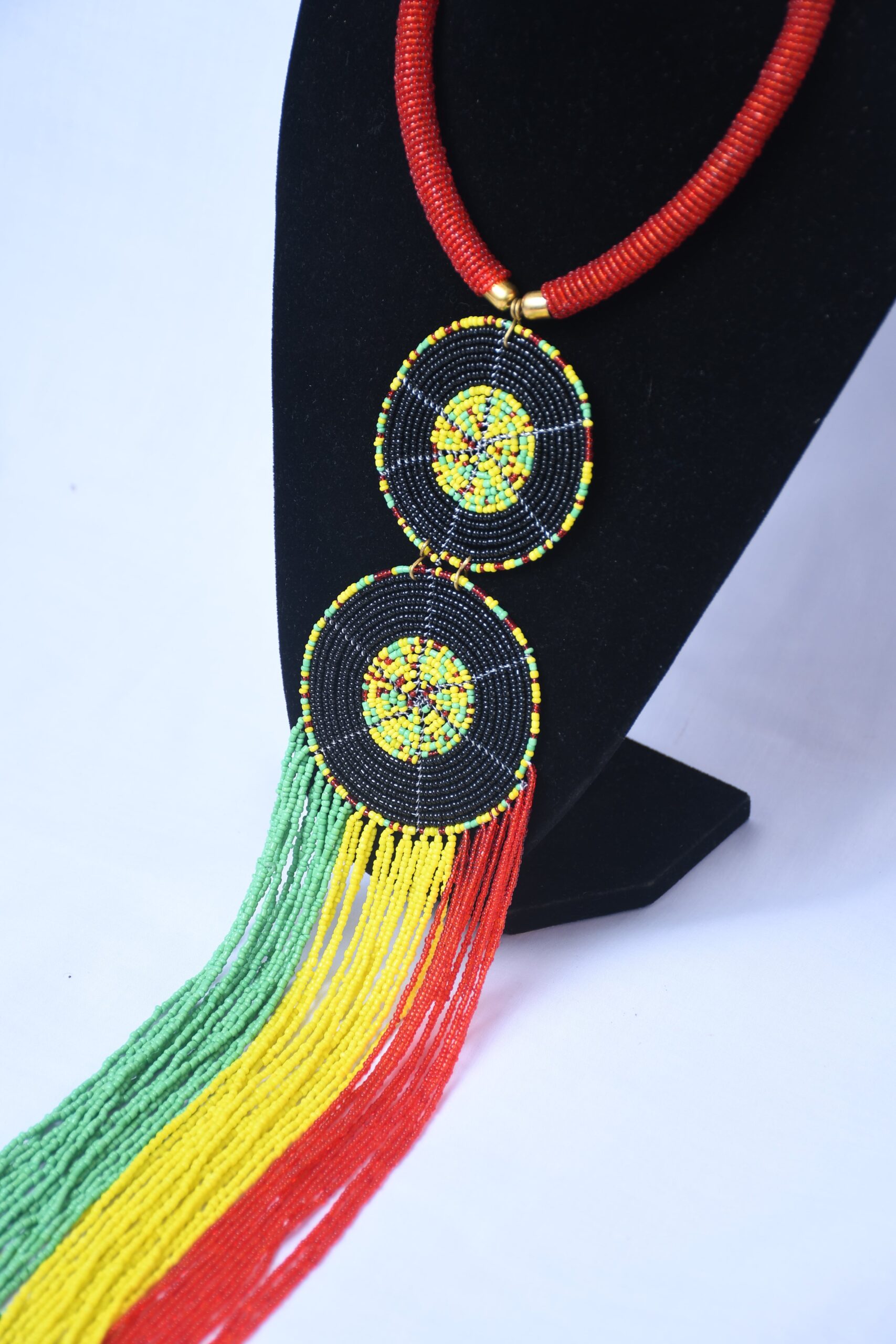 Celebrate cultural heritage with this bold statement necklace featuring twin black beaded discs adorned with vibrant yellow and green spiral patterns. The red rope-style collar and dramatic tri-colored tassels in green, yellow, and red create a stunning tribute to Rastafarian colors, while brass accents add an elegant finishing touch to this handcrafted piece.