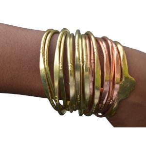 This eye-catching set features a collection of slender bangles in both warm brass and rich copper tones, creating a beautiful mixed-metal aesthetic on the wrist. The thinner bangles offer a delicate and layered look, adding subtle shimmer and movement. Complementing these is a wider, statement brass cuff with a unique, organically shaped cutout design. This cuff serves as a focal point, contrasting beautifully with the stack of thinner bangles. Wear the entire set for a bold and stylish statement, or mix and match the thinner bangles for a more understated elegance. The combination of brass and copper adds a touch of warmth and individuality to any outfit.