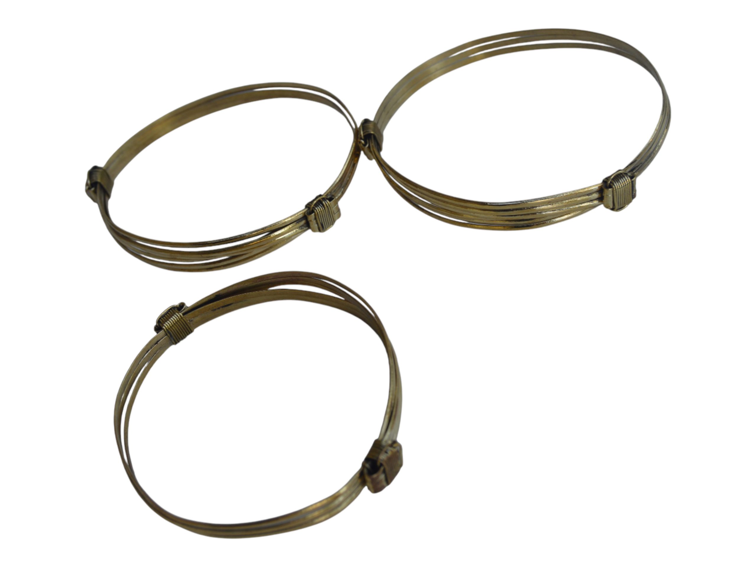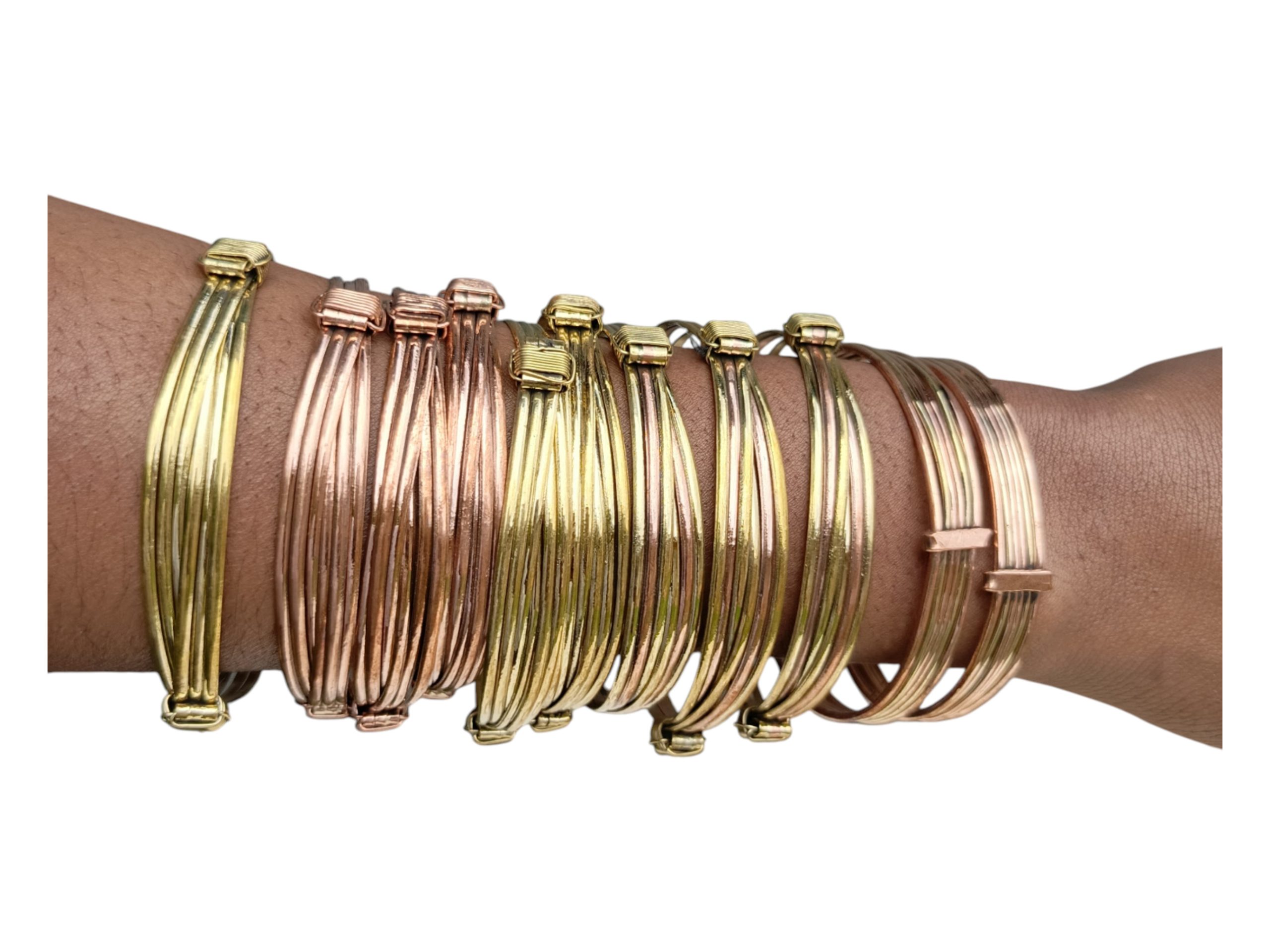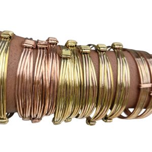 This striking set features a collection of multi-strand bangles in both warm brass and rich copper tones. Each bangle is crafted with multiple slender wires bound together at the ends, creating a textured and dimensional look on the wrist. The alternating brass and copper bangles offer a beautiful mixed-metal aesthetic, adding warmth and versatility to any outfit. The lightweight design ensures comfortable wear, whether you stack them all together for a bold statement or wear a few at a time for a more subtle touch. This set is perfect for adding a touch of bohemian elegance or a unique, handcrafted feel to your jewelry collection.