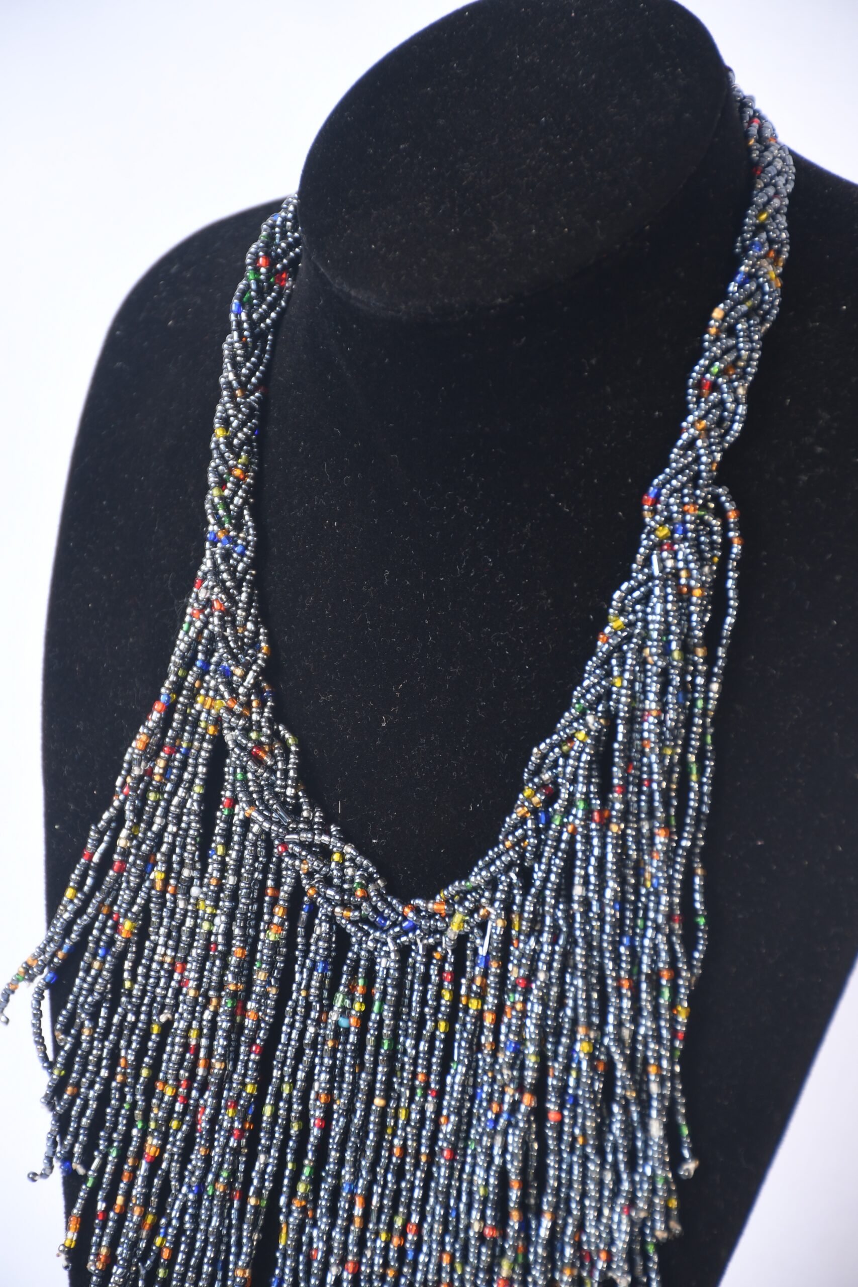 Inspired by a starry night sky, this elegant waterfall necklace features flowing strands of midnight blue beads dotted with multicolored accents that sparkle like distant stars. The intricate fringe design creates mesmerizing movement while the subtle rainbow speckles add an enchanting touch of whimsy to this sophisticated piece.