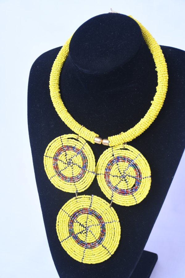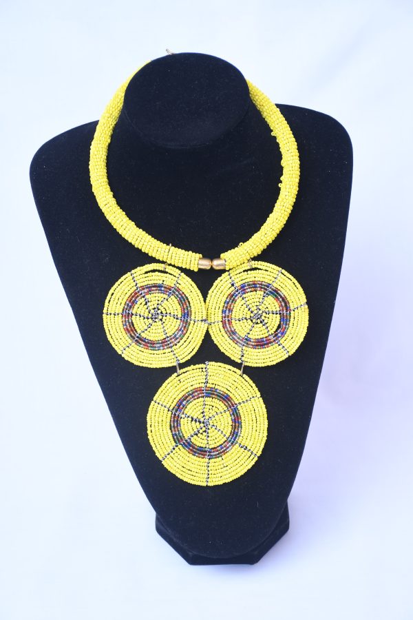 Make a bold fashion statement with this eye-catching yellow beaded necklace featuring three intricately crafted circular medallions. Each disc showcases traditional Maasai beadwork with concentric patterns in vibrant yellows accented by subtle multicolored details, creating a stunning piece of wearable art that celebrates authentic East African craftsmanship.Make a bold fashion statement with this eye-catching yellow beaded necklace featuring three intricately crafted circular medallions. Each disc showcases traditional Maasai beadwork with concentric patterns in vibrant yellows accented by subtle multicolored details, creating a stunning piece of wearable art that celebrates authentic East African craftsmanship.